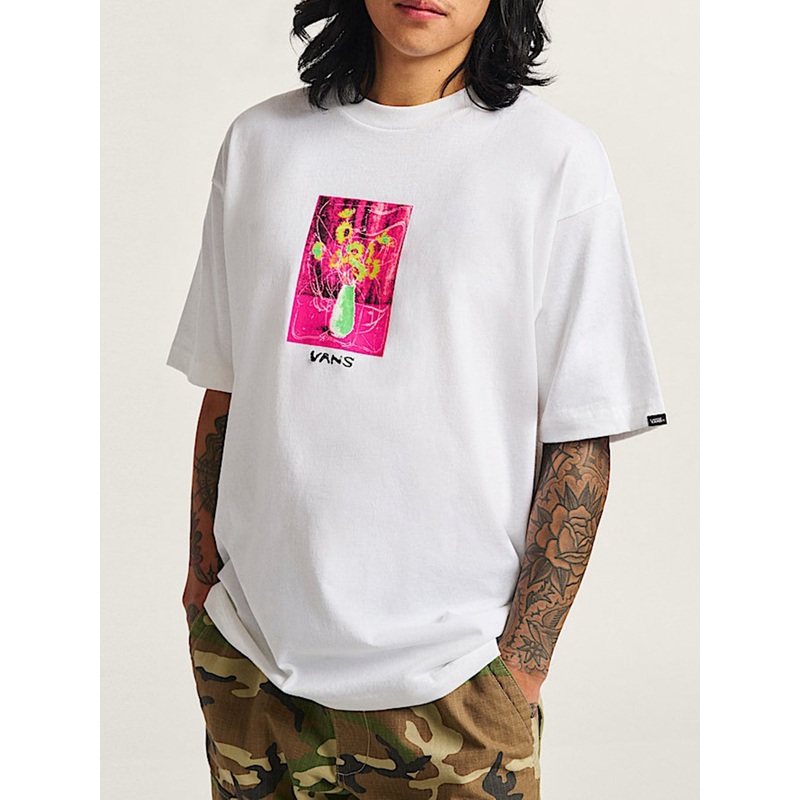 DescriptionLet yourself bloom in the Floral Decor T-Shirt, a loose fit short sleeve crew neck T-shirt with a screenprinted graphic of a vase full of flowers in neon colors atop the Vans logo on the front.